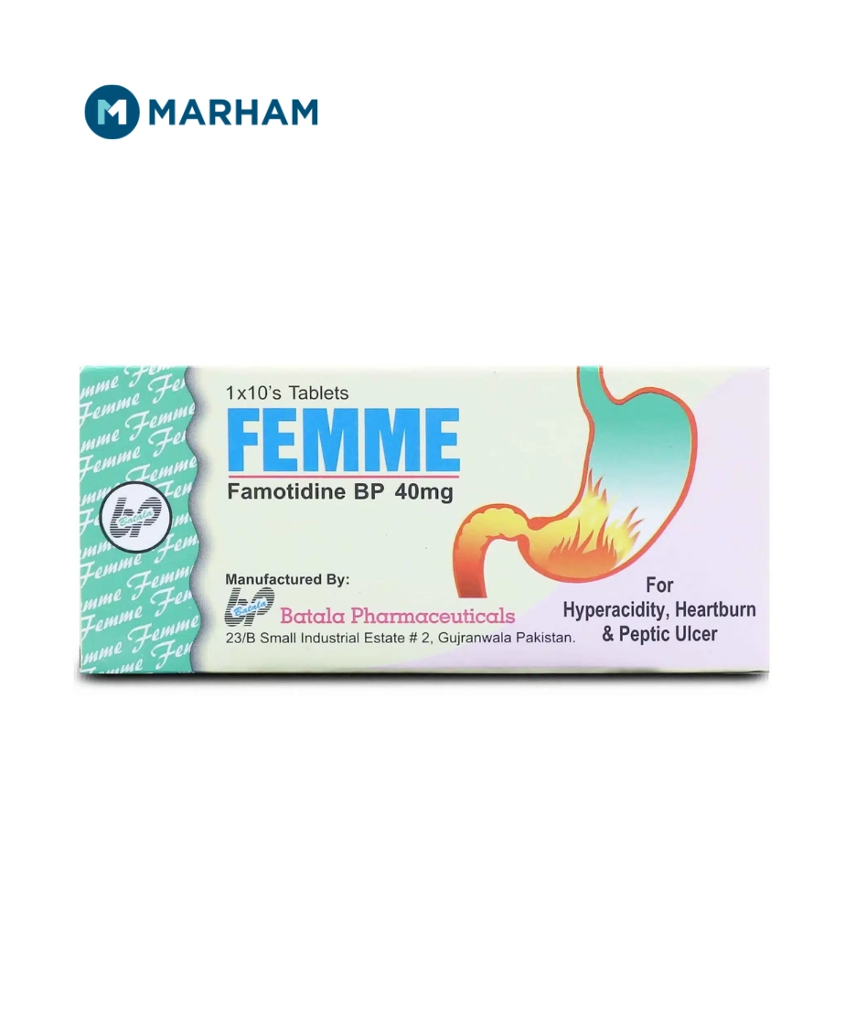 Femme Tablet uses include reducing excess stomach acid to help relieve heartburn, indigestion, and acid reflux problems commonly faced by patients in Pakistan. It works by lowering acid production in the stomach, which helps protect the stomach lining and promotes healing of ulcers when taken as advised by a doctor.