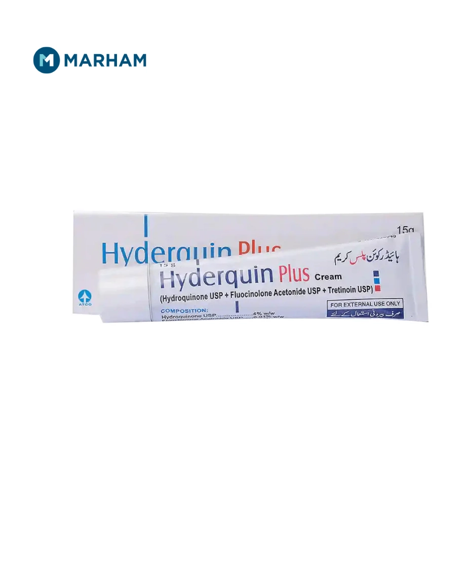 Hyderquin Plus Cream uses include reducing dark patches on the skin caused by excess pigmentation and uneven skin tone. This cream is commonly used for facial skin issues like melasma and helps improve overall skin appearance when used under medical guidance in Pakistan.