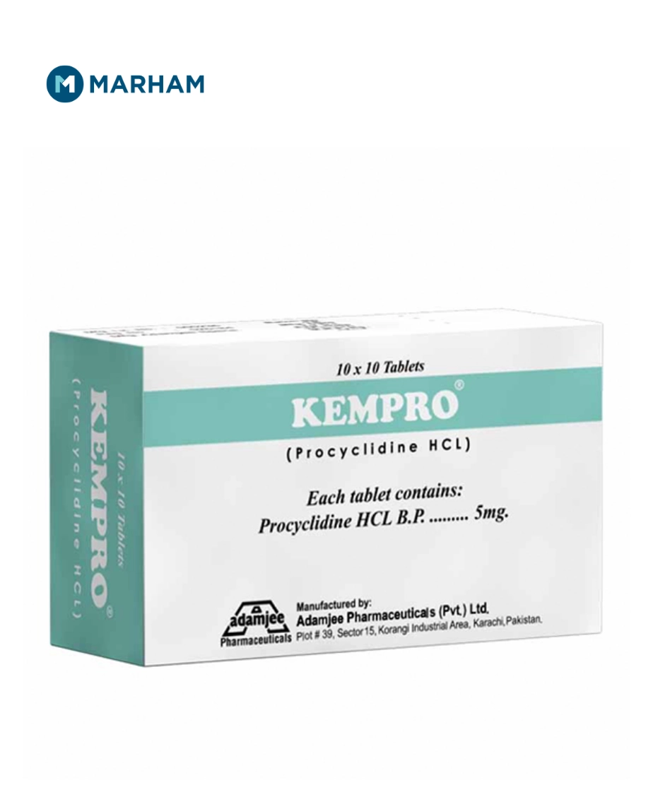 Kempro tablet uses include managing movement disorders by balancing neurotransmitter activity in the brain. It contains Procyclidine, an anticholinergic that reduces involuntary muscle movements, tremors, stiffness, and rigidity. Doctors usually prescribe it to treat Parkinson’s disease symptoms and movement disorders caused by certain medications.