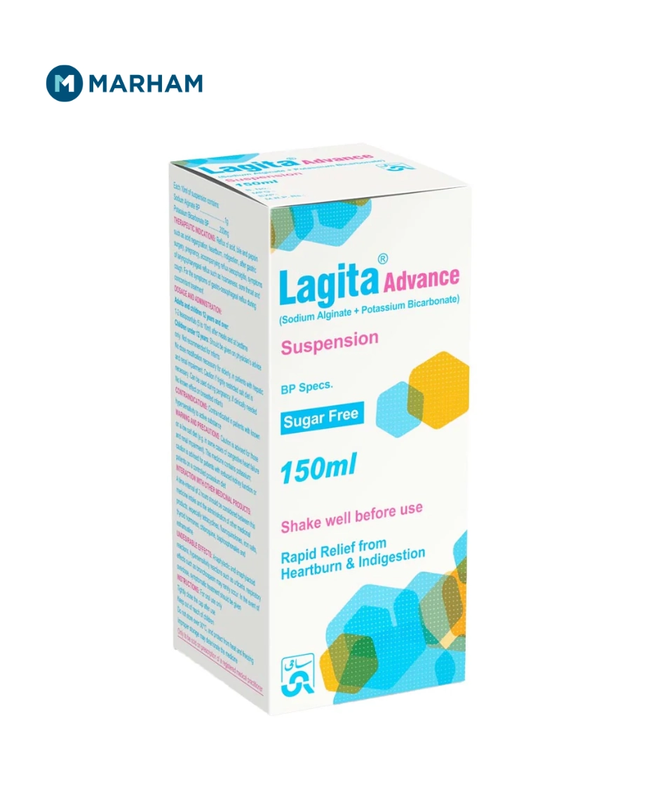 Lagita Advance Syrup uses include relief from acid reflux, heartburn, and indigestion. It contains sodium alginate, which forms a protective layer on top of stomach contents to stop acid from flowing back into the food pipe. Potassium bicarbonate works as an antacid and helps neutralize excess stomach acid. This combination provides fast and long-lasting relief from acid-related discomfort.