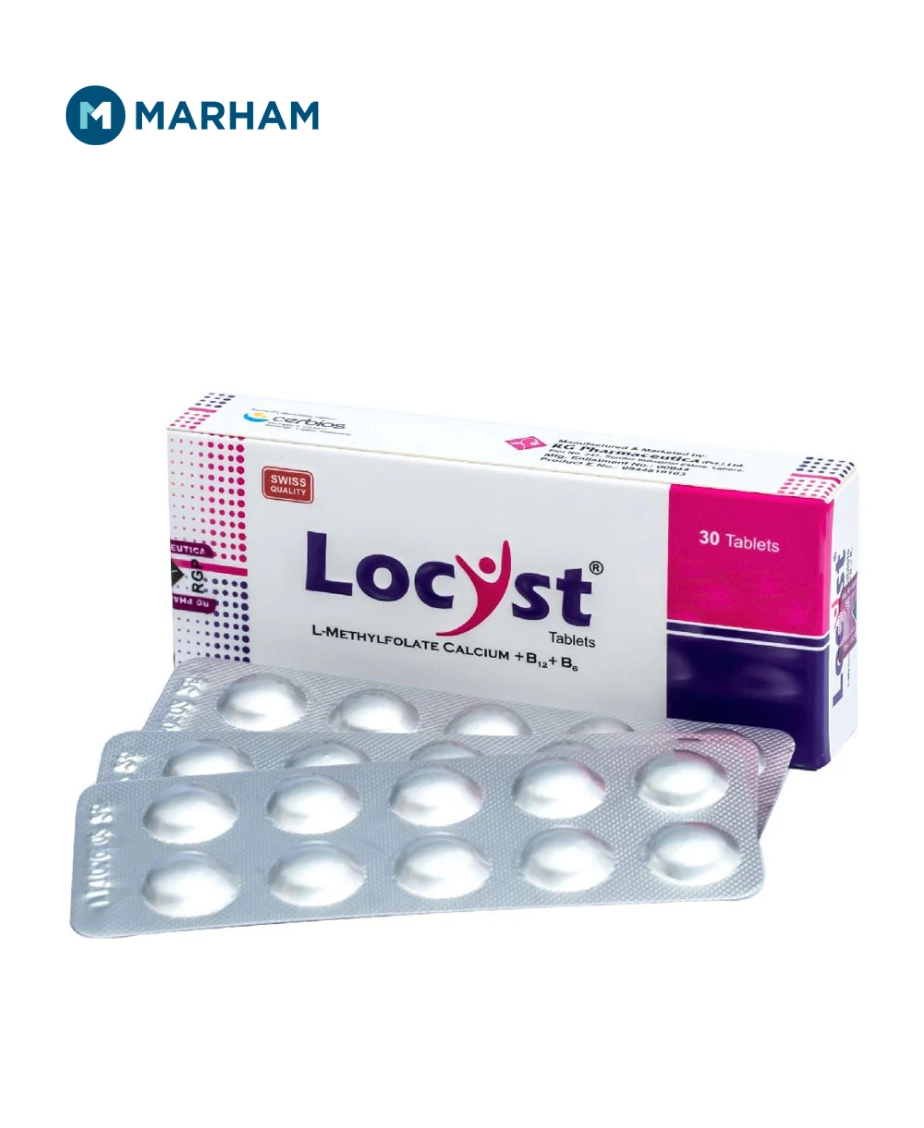 Locyst tablet is a specially formulated supplement combining L-methylfolate (an active form of folate) with Vitamins B6 and B12. It works by helping restore and maintain adequate folate and B-vitamin levels. This supports healthy red blood cell production, nerve function, and overall metabolic balance. Locyst tablet is also used in conditions like folate deficiency, high homocysteine levels, and vitamin B deficiencies.