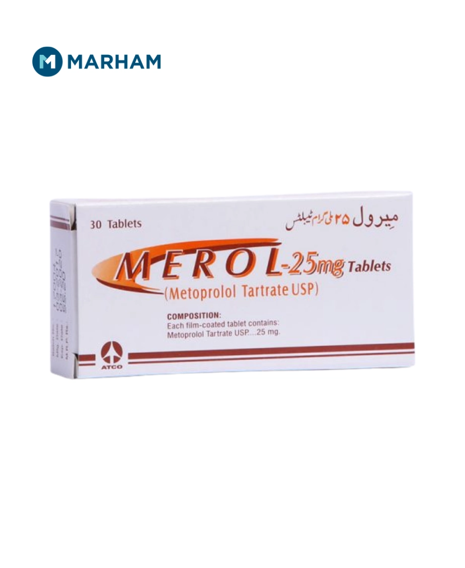 Merol Tablet uses include the treatment of high blood pressure, angina (chest pain), and heart conditions. It contains Metoprolol Tartrate, a cardioselective beta-blocker that works by blocking the effects of adrenaline on the heart. This reduces heart rate, lowers blood pressure, and decreases the heart's workload, helping to prevent heart attacks and strokes.