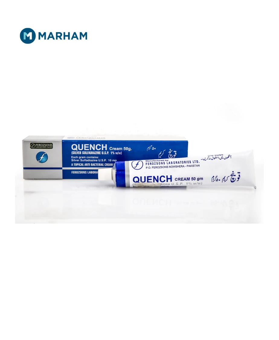 Quench Cream is a topical antibacterial medication used to prevent and treat infections in second‑ and third‑degree burns, wounds, and skin ulcers. Quench Cream uses include treating burn wound infections, skin grafts, pressure sores, and leg ulcers. It works by slowly releasing silver ions that attach to bacterial DNA and inhibit bacterial growth without harming healthy skin cells.