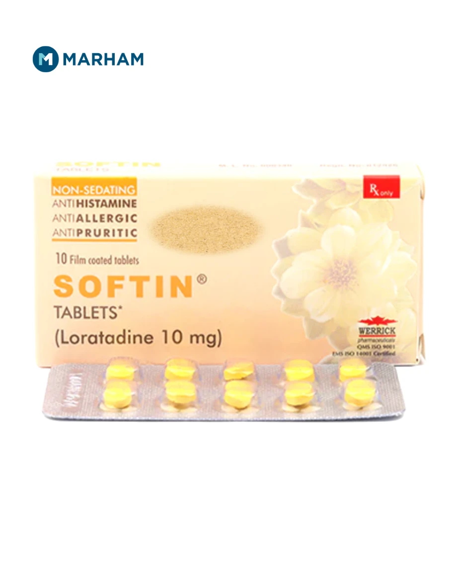 Softin Tablet is an anti-allergic medication that works against allergy mediators and stops them. It deals with allergic symptoms without causing drowsiness. Softin Tablet uses include the treatment and management of allergic rhinitis, hives, and pruritus. The active ingredient, Loratadine, relieves allergy symptoms effectively without sedative effects.