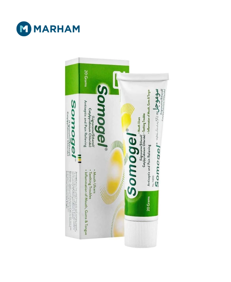 Somogel uses include relieving pain, inflammation, and discomfort caused by mouth ulcers, gingivitis, glossitis, and minor dental injuries. It also helps in maintaining oral hygiene and preventing infections. Somogel is an oral antiseptic and anaesthetic preparation used for mouth ulcers, sore gums, and other oral irritations. It contains Lignocaine, which provides pain relief by numbing the affected area, and Menthol and Eucalyptol, which give a soothing and cooling effect.